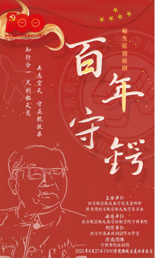 為慶祝中國共產(chǎn)黨成立100周年,繁榮校園美育文化傳播,弘揚空天報國情懷,傳承守正出新精神,北航學院守鍔書院師生原創(chuàng)話劇《百年守鍔》應邀作為北航首屆藝術(shù)節(jié)“大師劇”系列首場演出,將于4月27日晚19:00在北航晨興音樂廳準時上演。