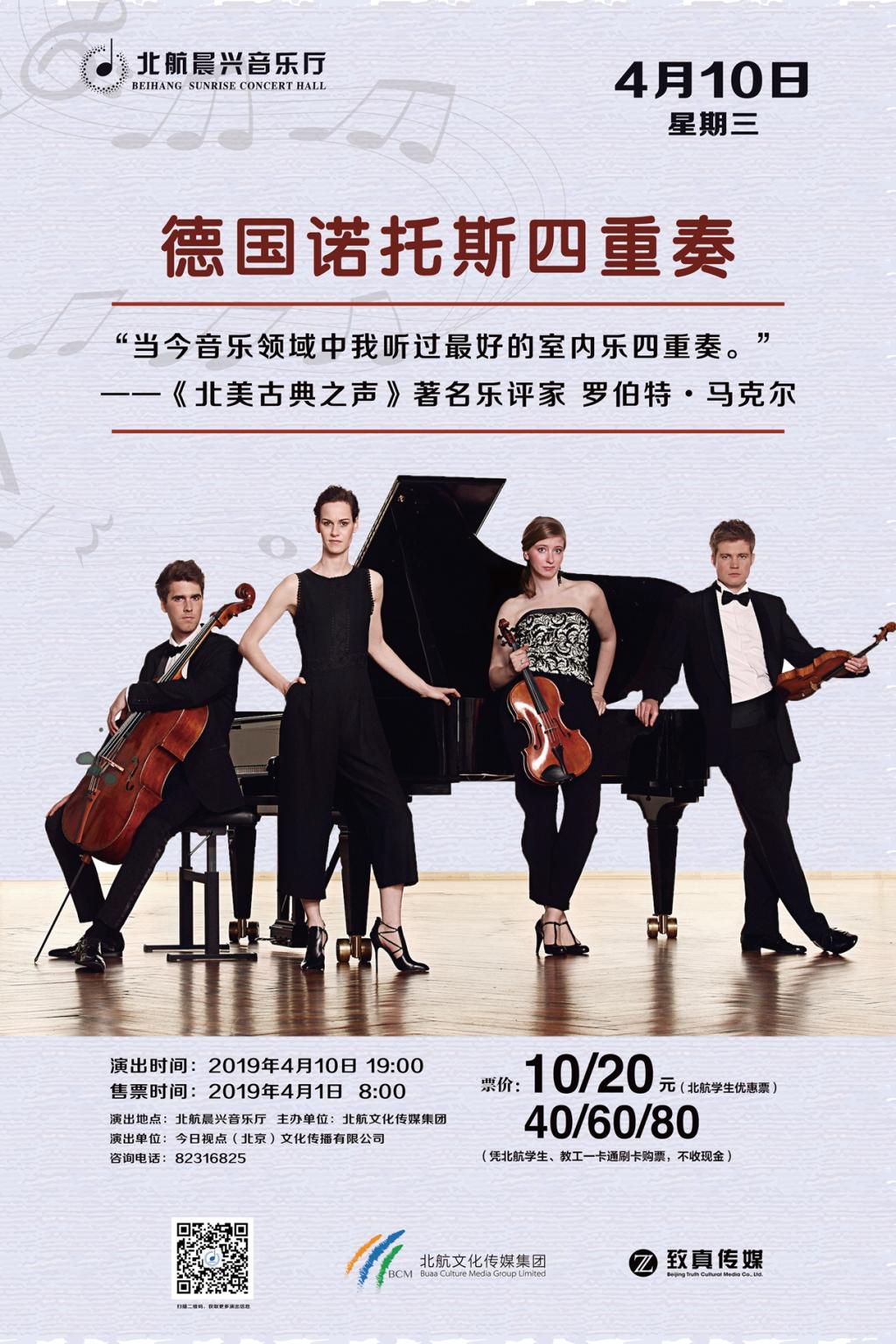 德國諾托斯四重奏被譽(yù)為當(dāng)今最杰出的室內(nèi)樂四重奏(德國音樂期刊Fono Forum)。他們精湛的音樂才華,完美的演奏技巧以及完美平衡演奏出古典樂曲中的每個細(xì)節(jié),深深的從心靈深處打動全球樂評家以及古典樂迷。團(tuán)隊成員主要有:信德里·雷德勒—小提琴、安德利亞·伯爾格—中提琴、菲利普·格萊姆—大提琴、安東尼婭·古斯特—鋼琴。諾托斯四重奏自2007年成立以來,獲得了眾多國際比賽的首獎,其中包含了中國勛菲爾德國際弦樂賽,艾爾米國際室內(nèi)樂大賽,荷蘭查爾斯荷楠克爾克斯國際室內(nèi)樂大賽,意大利佛羅倫薩維托里奧·古依大賽以及英國倫敦帕克豪斯大賽等。