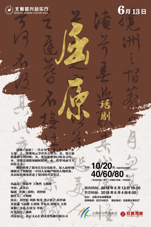 原定于2018年6月13日的話劇《屈原》因演出方主要演員檔期問題取消,我單位將于即日起到2018年6月20日在工作日對購票觀眾進行全額退票。