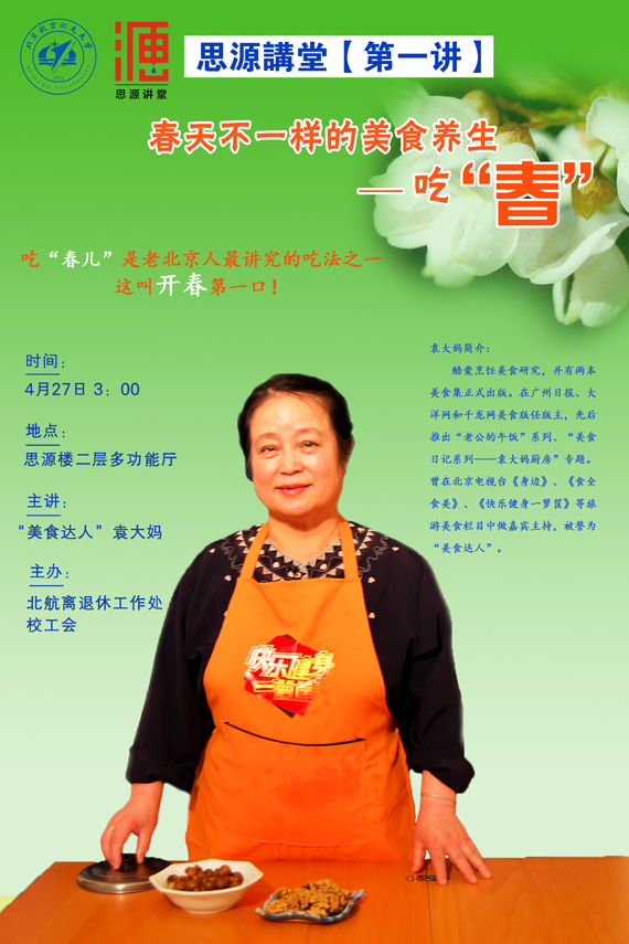 4月27日,由離退休工作處、校工會共同主辦的北航思源講堂首講,邀請“美食達人”、曾在北京電視臺《食全食美》等欄目擔任嘉賓主持的 “袁大媽”帶來: