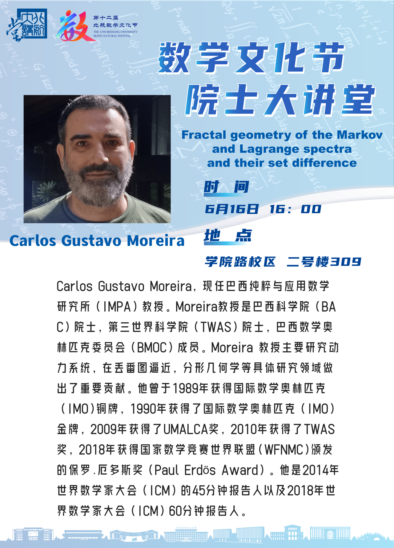 Carlos Gustavo Moreira,現任巴西純粹與應用數學研究所(IMPA)教授。Moreira教授是巴西科學院(BAC)院士,第三世界科學院(TWAS)院士,巴西數學奧林匹克委員會(BMOC)成員。Moreira 教授主要研究動力系統,在丟番圖逼近,分形幾何學等具體研究領域做出了重要貢獻。他曾于1989年獲得國際數學奧林匹克(IMO)銅牌,1990年獲得了國際數學奧林匹克(IMO)金牌,2009年獲得了UMALCA獎,2010年獲得了TWAS獎,2018年獲得國家數學競賽世界聯盟(WFNMC)頒發的保羅.厄多斯獎(Paul Erd?s Award)。他是2014年世界數學家大會(ICM)的45分鐘報告人以及2018年世界數學家大會(ICM)60分鐘報告人。