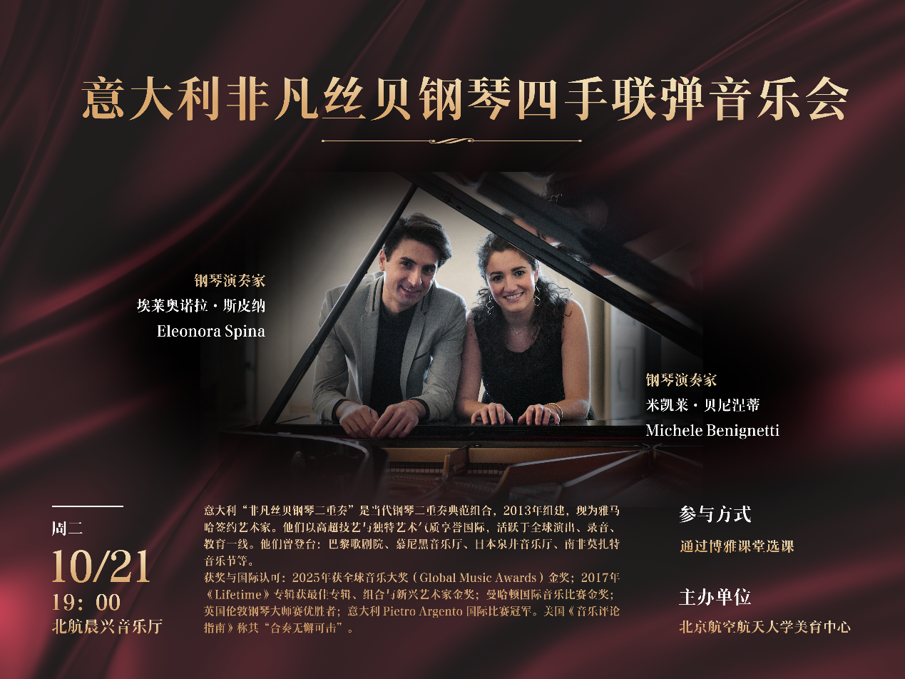 意大利“非凡絲貝鋼琴二重奏”是當(dāng)代鋼琴二重奏典范組合,2013年組建,現(xiàn)為雅馬哈簽約藝術(shù)家。他們以高超技藝與獨(dú)特藝術(shù)氣質(zhì)享譽(yù)國際,活躍于全球演出、錄音、教育一線。