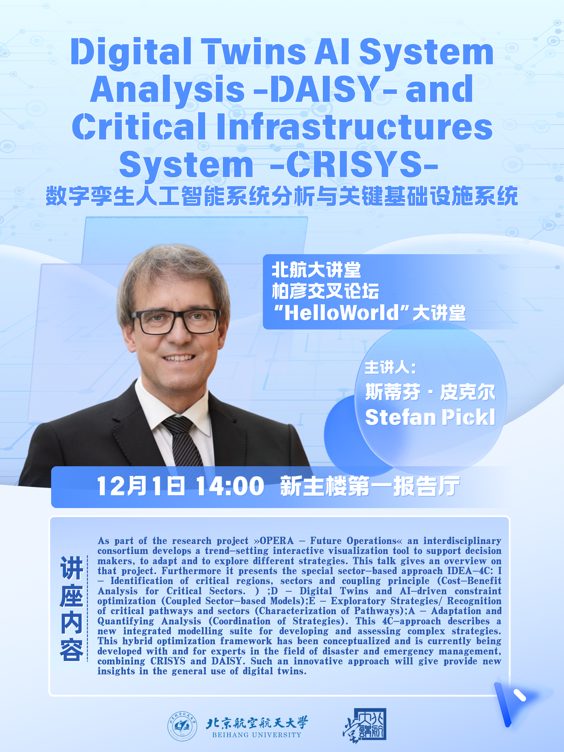 斯蒂芬·皮克爾教授是德國慕尼黑聯(lián)邦國防大學首席教授,并同時當選德國國家科學院與工程院雙院院士。他還擔任德國運籌學會咨詢委員會主席、德國聯(lián)邦信息技術學會執(zhí)行委員會委員等重要職務。皮克爾教授長期專注于人工智能在復雜裝備系統(tǒng)中的應用研究,憑借其在數(shù)字工程、人工智能及智能決策優(yōu)化領域的卓越貢獻,在德國乃至國際數(shù)字工程研究界享有盛譽。