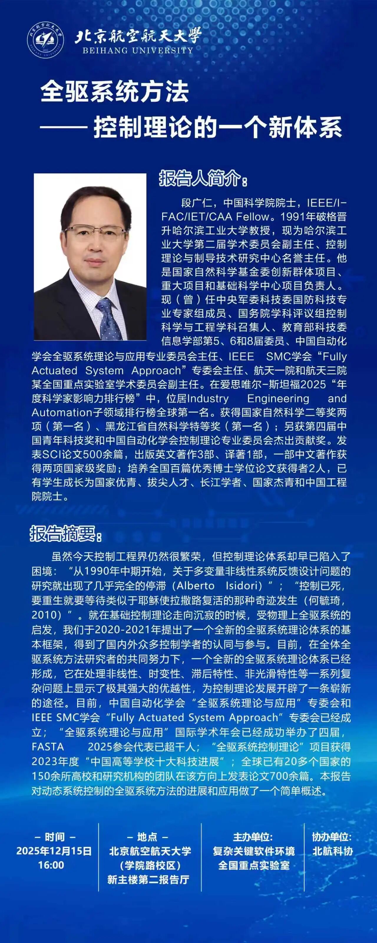 段廣仁,中國科學院院士,IEEE/IFAC/IET/CAA Fellow。1991年破格晉升哈爾濱工業大學教授,現為哈爾濱工業大學第二屆學術委員會副主任、控制理論與制導技術研究中心名譽主任。他是國家自然科學基金委創新群體項目、重大項目和基礎科學中心項目負責人。現(曾)任中央軍委科技委國防科技專業專家組成員、國務院學科評議組控制科學與工程學科召集人、教育部科技委信息學部第5、6和8屆委員、中國自動化學會全驅系統理論與應用專業委員會主任、IEEE SMC學會“Fully Actuated System Approach”專委會主任、航天一院和航天三院某全國重點實驗室學術委員會副主任。在愛思唯爾-斯坦福2025“年度科學家影響力排行榜”中,位居Industry Engineering and Automation子領域排行榜全球第一名。獲得國家自然科學二等獎兩項(第一名)、黑龍江省自然科學特等獎(第一名);另獲第四屆中國青年科技獎和中國自動化學會控制理論專業委員會杰出貢獻獎。發表SCI論文500余篇,出版英文著作3部、譯著1部,一部中文著作獲得兩項國家級獎勵;培養全國百篇優秀博士學位論文獲得者2人,已有學生成長為國家優青、拔尖人才、長江學者、國家杰青和中國工程院院士。