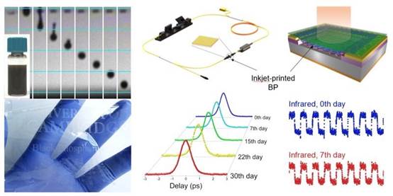 在黑磷噴墨打印技術(shù)的研究中,張夢(mèng)老師及其課題組通過精確控制墨水化學(xué)成分并平衡其相互競爭的流體效應(yīng)得到穩(wěn)定的黑磷墨水,該墨水能高質(zhì)量、高均勻性、高速地大規(guī)模打印新型功能性光電器件。采用該方法打印的黑磷應(yīng)用到激光器中用作超快光開關(guān),將激光器的連續(xù)光輸出轉(zhuǎn)變?yōu)槌堂}沖序列,有利于該項(xiàng)技術(shù)在工業(yè)和醫(yī)療方面的推廣應(yīng)用。張夢(mèng)老師表示:“相比于其它研究,我們使用打印黑磷設(shè)計(jì)的非線性光學(xué)器件顯著提升了運(yùn)轉(zhuǎn)性能和穩(wěn)定性。”